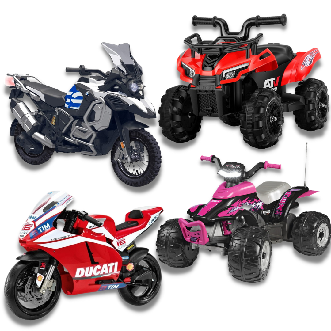 Ce ne sono per tutte le tasche e per tutti i gusti: Enduro, Moto Stradali come la Ducati o le BMW, Mini Vespe Piaggio e Scooter. I Quad e le moto elettriche sono adatte per bambini dai 2 anni in sù e fino a 25 Kg.