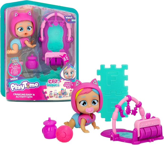 Cry Babies Play Time Millie Bambola da Collezione Day Care misura 7 cm ed è dotata di una palestrina di attività. Ci sono molti oggetti da spostare e scoprire. Millie gattona come un vero bebè e piange lacrime vere che rivelano un disegno per magia. Inoltre, Millie è dotata di 7 accessori con cui giocare