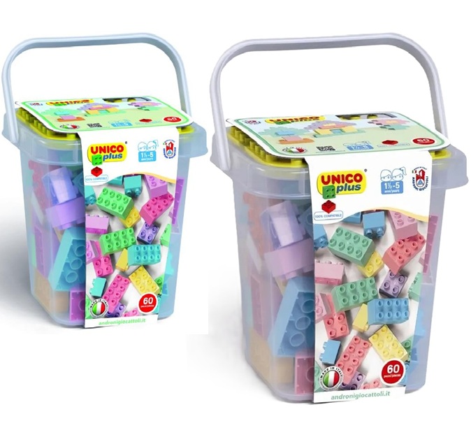 Questo set Unico include 60 mattoncini da costruzione dai colori vivaci: verde, rosso, giallo e blu, compatibili con le marche di mattoncini più diffuse. Confezionato in un secchiello con coperchio che funge anche da base, è perfetto per il gioco creativo e per riporre i mattoncini.