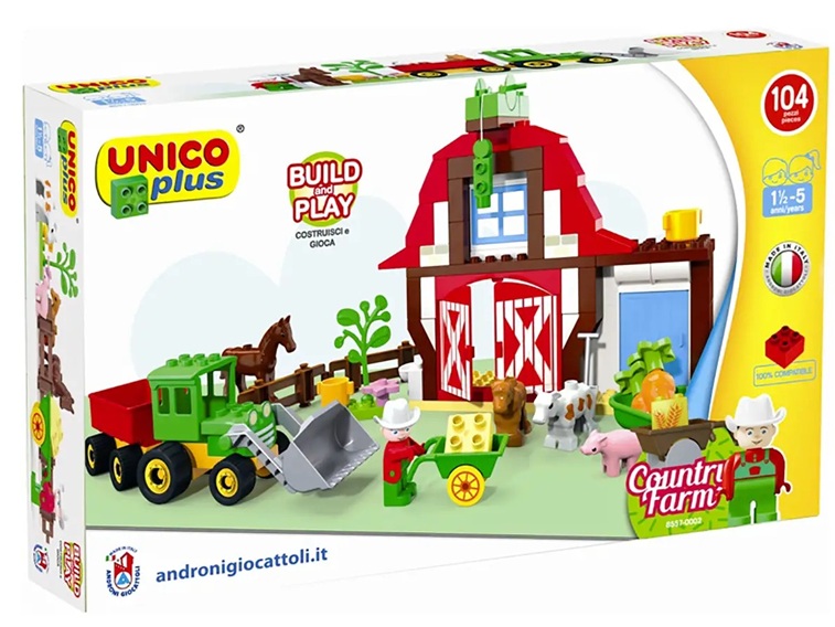 La Country Farm Unico Plus offre 104 pezzi per creare una fattoria completa e ricca di dettagli. Il set consente ai bambini di costruire strutture, spazi di gioco e scenari realistici, favorendo creatività e gioco attivo.