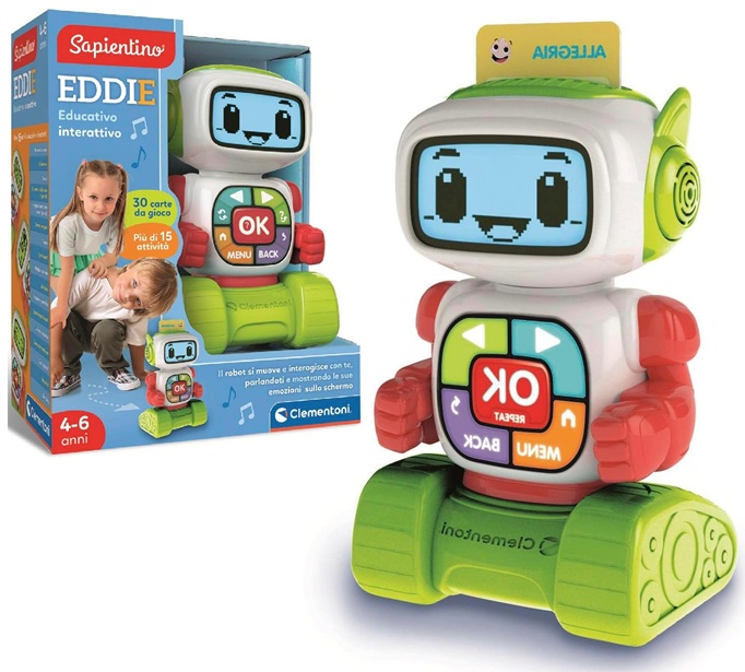 COSA CONTIENE: gioco educativo Clementoni Made in Italy, adatto per bambini dai 4 ai 6 anni, include 1 robot educativo interattivo con schermo LCD, 30 carte illustrate per attività didattiche e 1 manuale di gioco