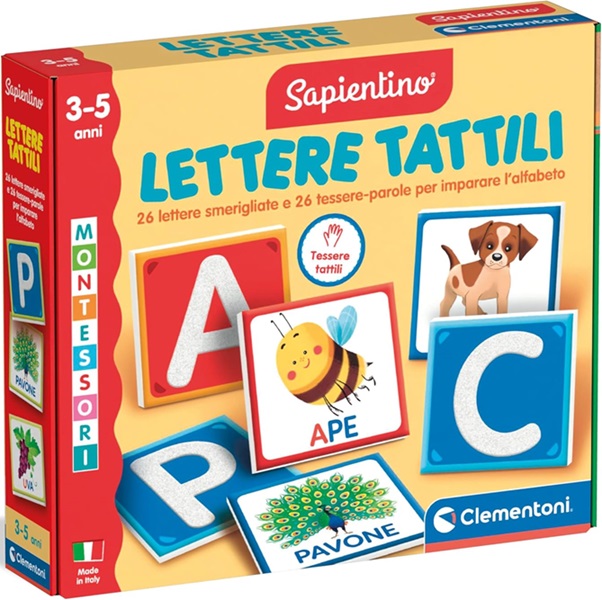 Questo kit contiene 26 tessere con le lettere smerigliate, ovvero con una speciale finitura ruvida al tatto: il bambino tocca la superficie delle lettere e ne memorizza la forma.