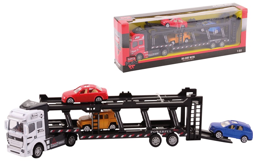 Camion Bisarca Die Cast Metal trasporto auto Scala 1:50 con 3 veicoli inclusi Retrocarica,