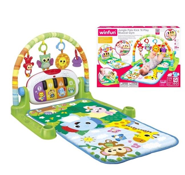 Tastiera piano staccabile con 4 tasti illuminati e 2 modalita’ di gioco: 1. Animali/suoni divertenti e assoli; 2. Melodie o ninne nanne. Sposta la tastiera in verticale per suonare con i piedi, inclina per giocare da seduti. Tappetino morbido e imbottito, facile da pulire. 4 adorabili giocattoli appesi che incoraggiano il bambino a raggiungerli ed afferrarli. Portala sempre con te.