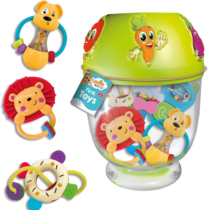 - Sonagli, giochi da dentizione, 5 giochi sensoriali, esclusivo packaging barattolo