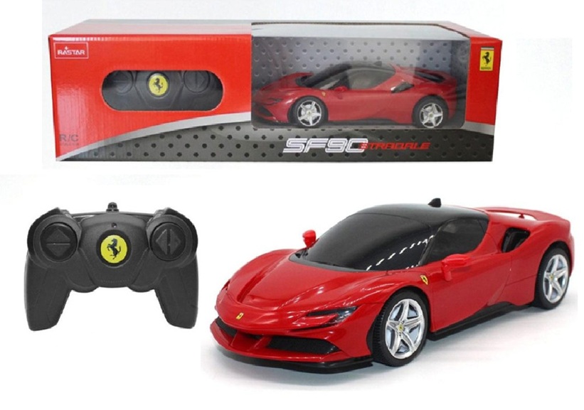 La R/C 1:24 Ferrari SF90 Stradale di Rastar e’ un modello auto radiocomandato dettagliato. Con una lunghezza di 20cm, una larghezza di 11cm, questo modello ha una dimensione compatta, ideale per l’uso sia interno che esterno. Il veicolo e’ realizzato in scala 1:24, rendendolo una replica realistica del famoso Ferrari SF90 Stradale. La licenza di Ferrari garantisce un design autentico e una lavorazione di alta qualita’. Questa auto radiocomandata non solo promuove le abilita’ motorie, ma offre anche ore di divertimento e la possibilita’ di scoprire la passione per le auto e la tecnologia. Sono necessarie 3 pile AA per alimentare l’auto e 2 pile dello stesso tipo per alimentare il trasmettitore NON INCLUSE