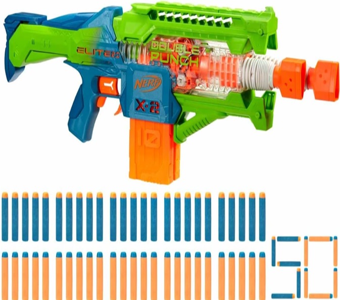 Nerf Elite 2.0, blaster lancia-dardi Double Punch, 50 dardi Nerf Elite, 2 caricatori da 10 dardi, blaster Nerf motorizzato, dagli 8 anni in su